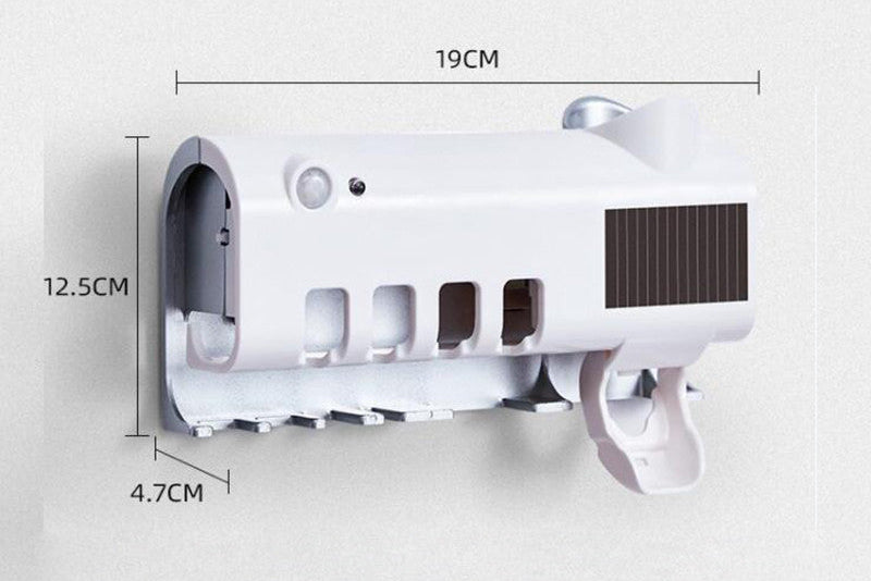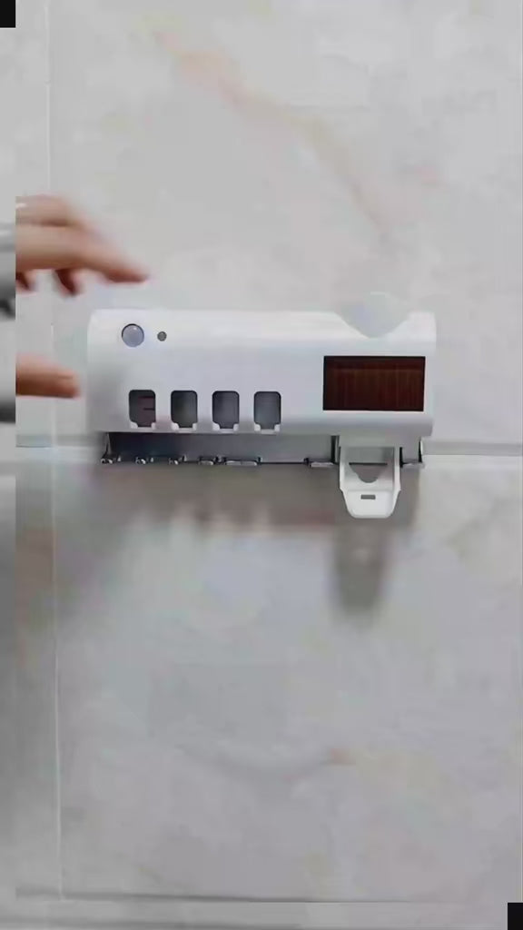 ✔️ Stérilise vos brosses à dents grâce à la lumière UV ✔️ Distribue le dentifrice automatiquement — hygiène + praticité ✔️ Installation facile sans perçage (adhésif mural inclus) ✔️ Recharge solaire ou USB — pas besoin de prise ✔️ Parfait pour toute la famille (jusqu'à 5 brosses)